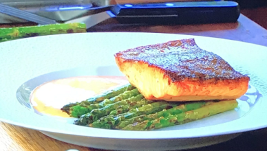 James Martin served up a tasty roasted sea trout fillet with blood orange hollandaise and English asparagus on James Martin’s Saturday Morning. The