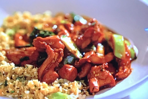 Prue Leith and Charlotte Church served up a tasty Japanese style yakitori chicken stir fry with tamari gluten free soy sauce, bok Choy, mushrooms and cauliflower rice on Prue Leith’s Cotswold Kitchen.