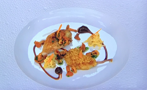 Kenny Atkinson served up tasty poached and roasted quail with confit duck, celeriac, pickled mushrooms and red wine puree on James Martin’s Saturday Morning.