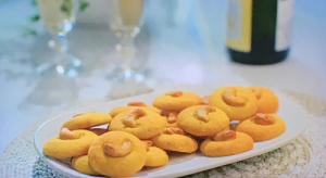 The ingredients are: 115g baking spread, at room temperature, 55g semolina, 75g self-raising flour, 75g Parmesan, finely grated, ½ tsp mustard powder, 2 tsp Dijon mustard and 24 cashew nuts.