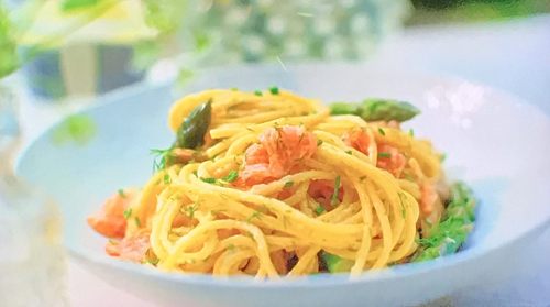 Mary Berry and Alan Tidmarsh served up a tasty smoked salmon and asparagus pasta with creme fraiche, mushrooms, dill and chives on Mary at 90: A Lifetime of Cooking.