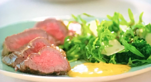 The ingredients for the beef and salad are: 4 beef tail fillets (175g each), olive oil, for frying, 2 tsp Dijon mustard, 200g tenderstem broccoli, 75g rocket, balsamic glaze, to drizzle, 55g Parmesan, shaved, salt and freshly ground black pepper.
