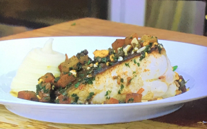 James Martin and Richard Corrigan served up tasty roasted halibut on the bone with sauce gribiche and mashed potatoe on James Martin’s Saturday Morning.