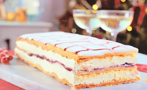 Mary Berry served up a delicious lemon and cherry millefeuille with puff pastry and lemon curd on A Mary Berry Christmas.