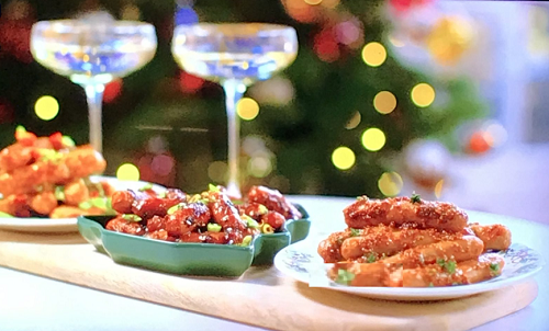 John Torode and Lisa Faulkner sausage three ways with gochujang paste, peanut butter and sesame, and honey and wholegrain mustard on John and Lisa’s Christmas Kitchen.