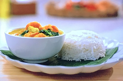 Pure Leith served up a tasty Cambodian fish and prawn amok for Angela Griffin on Prue Leith’s Cotswold Kitchen.