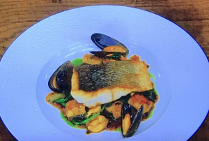 James Martin served up tasty homemade gnocchi with pan fried sea bass, mussels and herb oil for James Nesbitt on James Martin’s Saturday Morning.