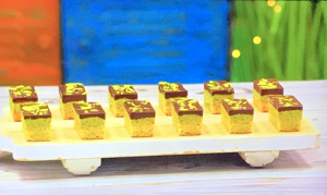 Rav Gill showcased delicious Dubai chocolate millionaire shortbread with pistachios for a technical challenge on Junior Bake Off.