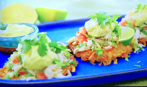 Ainsley Harriott served up tasty Plantain and Sweet Potato Rosti with Crab Salad and Hot Pepper Avocado on Ainsley’s Taste of the Bahamas.