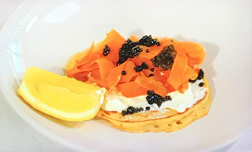 Prue Leith served up tasty vegetarian blinis with cream cheese, carrot strips and seaweed caviar on Prue Leith’s Cotswold Kitchen.