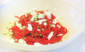 Prue Leith served up tasty red spaghetti with beetroot juice, onion, feta cheese and parsley on Prue Leith’s Cotswold Kitchen.
