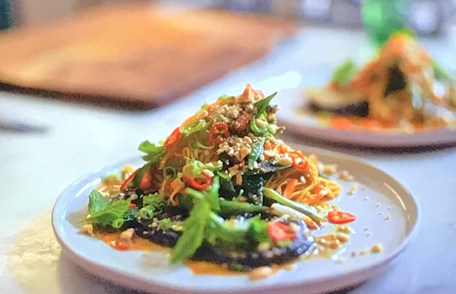 Jamie Oliver served up tasty silky aubergine noodles with toasted nuts and citrus sauce on Jamie’s Feast For A Fiver.
