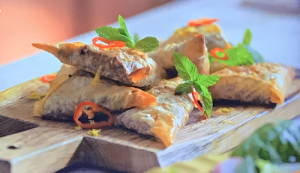 Jamie Oliver served up tasty crispy potato and chickpea parcels with Corner-shop salad and yoghurt dip on Jamie’s Feast For A Fiver.