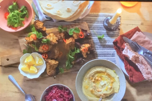 Jamie Oliver served up tasty gnarly celeriac skewers with flatbreads, cheat’s houmous and pickled cabbage on Jamie’s Feast For A Fiver.