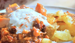 Jamie Oliver served up a tasty kinda winter chilli with coffee, chickpeas, sweet potatoes and frozen peppers on Jamie’s Feast For a Fiver.