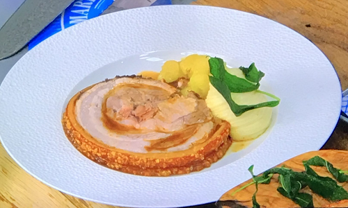 James Martin served up a tasty roast rolled pork loin with crackling, mashed potatoes, deep fried sage and apple sauce on James Martin’s Saturday Morning.