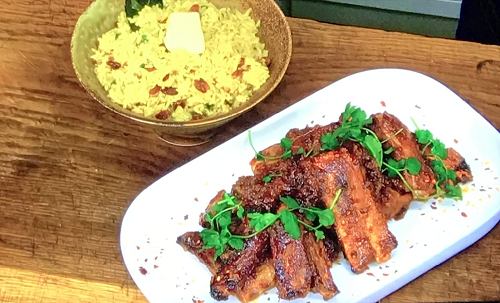 Paul Rankin served up tasty spiced apple and ginger glazed pork ribs with rice pilau on James Martin’s Saturday Morning.