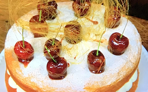 James Martin served up a tasty Genoise sponge with cherry compote whipped cream caramel-dipped cherries and candy floss on James Martin’s Saturday Morning.