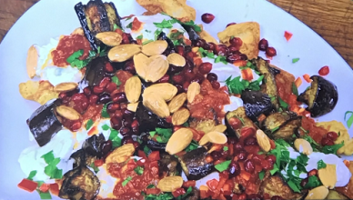 Sami Tamimi served up tasty Palestinian roasted aubergine fatteh with pitta bread on James Martin’s Saturday Morning. See recipes by Sami in his