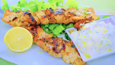 Ainsley Harriott grilled pineapple-rum pork skewers with pineapple tzatziki and a coconut salad recipe on Ainsley’s Taste Of The Bahamas