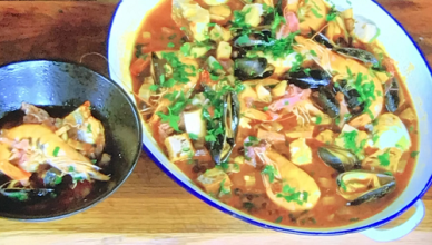 Stephen Terry served up tasty Salmon and Potato Fondant Fishcakes with Salad on James Martin’s Saturday Morning. The ingredients for the poached salmon