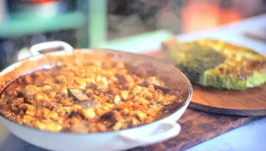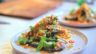 Jamie Oliver served up tasty silky aubergine noodles with toasted nuts and citrus sauce on Jamie’s Feast For A Fiver. The ingredients are: