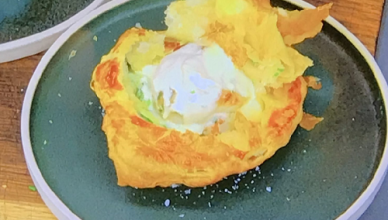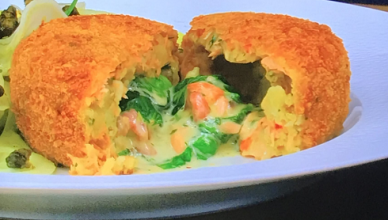Stephen Terry served up tasty Salmon and Potato Fondant Fishcakes with Salad on James Martin’s Saturday Morning. The ingredients for the poached salmon
