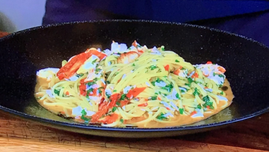 James Martin spicy crab linguine with lemon and chilli on James Martin’s Saturday Morning. The ingredients are: 200g dried linguini. For the sauce