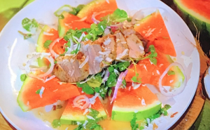 Ainsley Harriott served up a tasty Jerk-Style Pork Tenderloin with a Watermelon and Coconut Salad on Ainsley’s Fantastic Flavours.