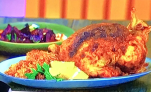 John Gregory Smith served up a tasty tandoori roast chicken and rice with roasted beetroot and harissa yoghurt on Sunday Brunch.