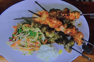 James Martin served up tasty BBQ chicken skewers with salad and homemade raita on James Martin’s saturday Morning.