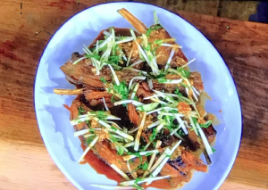 For the sauce: 1 onion, finely diced, 2 tbsp soy sauce, 1 tbsp rice wine vinegar, 1 tbsp caster sugar, 1 tsp mustard powder, Splash of water, 1 tbsp veg oil and 1 tsp sesame oil.