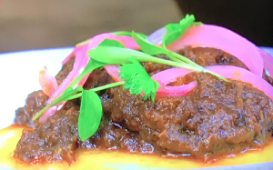 Aktar Islam served up a tasty beef vindaloo with rice south Indian pancakes pickles and coriander on James Martin’s Saturday Morning.