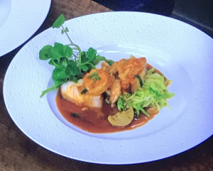 Glen Parnell served up tasty roasted monkfish on the bone with preserved lemons, hispi cabbage, watercress and cafe de Paris sauce on James Martin’s Saturday Morning.