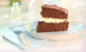 The ingredients are: 55g cocoa powder, sifted, 6 tbsp boiling water, 4 large free-range eggs, 225g baking spread, straight from the fridge, 225g caster sugar, 225g self-raising flour and 1 tsp baking powder.