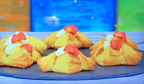 Rav Gill showcased delicious strawberry and clotted cream Danish pastry with a elderflower and strawberry jam and creme mousseline for the technical challenge in the final of Junior Bake Off.