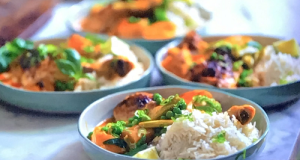 Jamie Oliver served up a tasty my Thai red chicken and squash traybake with frozen peas and ice on Jamie’s Feast For A Fiver.