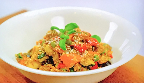 Prof. Tim Spector served up a tasty and healthy bulgur wheat bowl with peppers, aubergine, red onions and sauerkraut dressing on What Not To Eat.