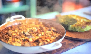 Jamie Oliver served up a tasty chicken, sausage and white bean bake with savoy cabbage and garlic croutons on Jamie’s Feast For A Fiver.