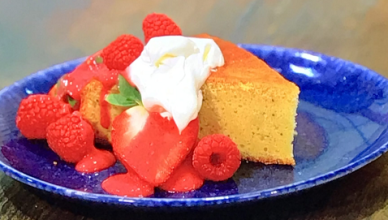 Simon Rimmer served up a delicious limoncello polenta cake with berries on Sunday Brunch. The ingredients are: 200g of polenta, 200g of self-raising