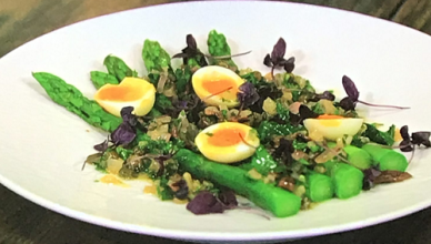 James Golding served up tasty asparagus with quail eggs and anchovy lemon butter on Sunday Brunch. The ingredients are: 4-6 asparagus spears, cooked