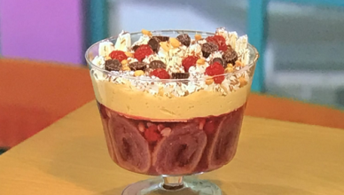Simon Rimmer served up a delicious peanut butter and jelly trifle with mascarpone and raspberries on Sunday Brunch. The ingredients are: 750ml of