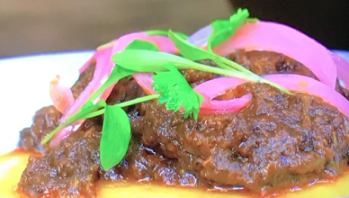 Aktar Islam served up a tasty beef vindaloo with rice south Indian pancakes pickles and coriander on James Martin’s Saturday Morning. See classic